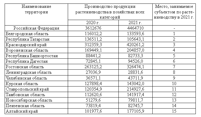 В соответствии с предоставленной организациями в 2021 году статистической отчетностью [23], количество организаций, специализирующихся на производстве растениеводческой продукции составило 17 539 ед., в т.ч. по видам деятельности ОКВЭД: 01.1 "Выращивание однолетних культур» - 14 850 ед., 01.2 "Выращивание многолетних культур" – 1150 ед., 01.3 "Выращивание рассады" – 217 ед., 01.6 Деятельность вспомогательная в области производства сельскохозяйственных культур и послеуборочной обработки сельхозпродукции (01.61 "Предоставление услуг в области растениеводства", 01.63 "Деятельность сельскохозяйственная после сбора урожая", 01.64 "Обработка семян для посадки") – 1522 ед.