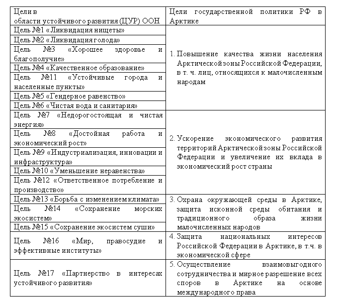 Таблица 3 Соотношение ЦУР ООН и целей государственной политики в Арктике