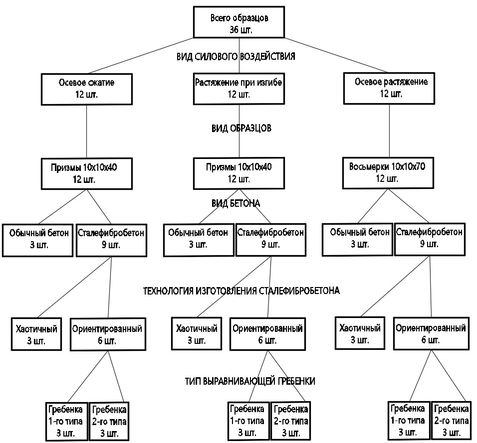 Опытные образцы будут разделены на 3 партии по 12 образцов, в зависимости от вида испытания. 3 образца из каждой партии являются эталонными и не будут содержать фибрового дисперсного армирования. Это необходимо для получения данных о фактической прочности бетона, используемого в экспериментах. Для оценки влияния предложенной авторами технологии укладки фибробетонной смеси на физико-механические свойства фибробетона, оставшиеся 9 образцов будут разделены на 2 части. 3 образца будут содержать фибровое дисперсное армирование с произвольным расположением армирующих волокон, а в остальных 6 с помощью предложенной авторами механической технологии будет создано агрегированное ориентированное расположение фибровых волокон. Эти образцы также будут делиться на 2 группы по 3 образца, в зависимости от типа конструкции выравнивающего элемента установки для укладки фибробетонной смеси.