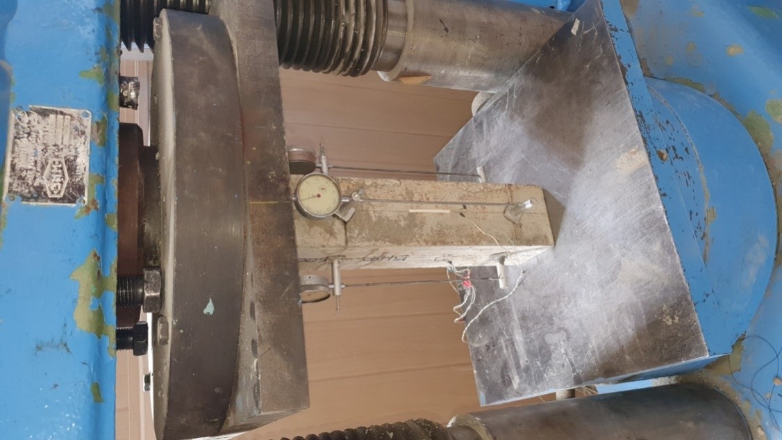 Всего на осевое сжатие было испытано 12 опытных образцов-призм. Из них 3 эталонные, не содержащие фибрового дисперсного армирования, 3 фибробетонные с хаотичным расположением фибровых волокон и 6 с фибровым агрегированным ориентированным армированием, которые также были разделены на 2 группы по 3 образца, в зависимости от типа выравнивающего элемента установки для укладки фибробетонной смеси. Общий вид испытаний на осевое сжатие образцов-призм приведен на Рис. 2.