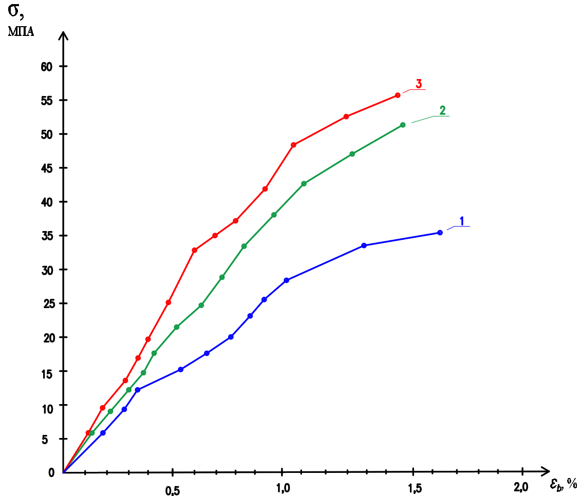 Рис. 3. Диаграммы деформирования бетона и фибробетона при сжатии: