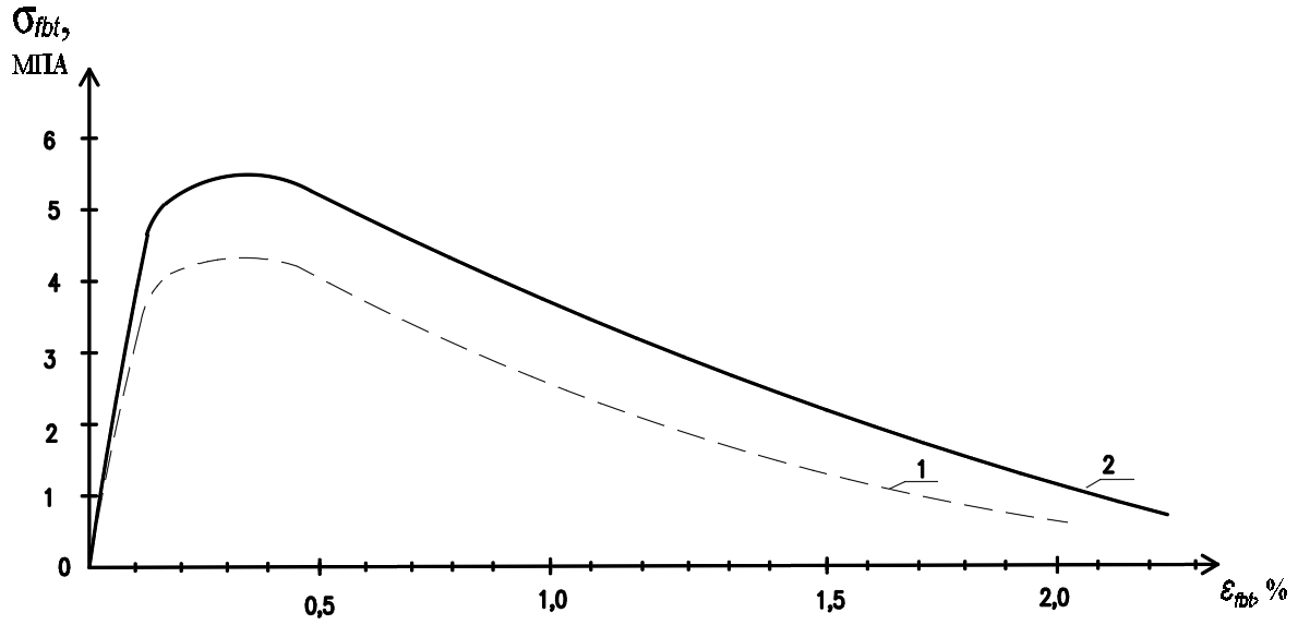 Рис. 4. Усредненные опытные диаграммы деформирования фибробетона при осевом растяжении: 1- фибробетон с произвольным и 2- усредненные с ориентированным расположением фибр