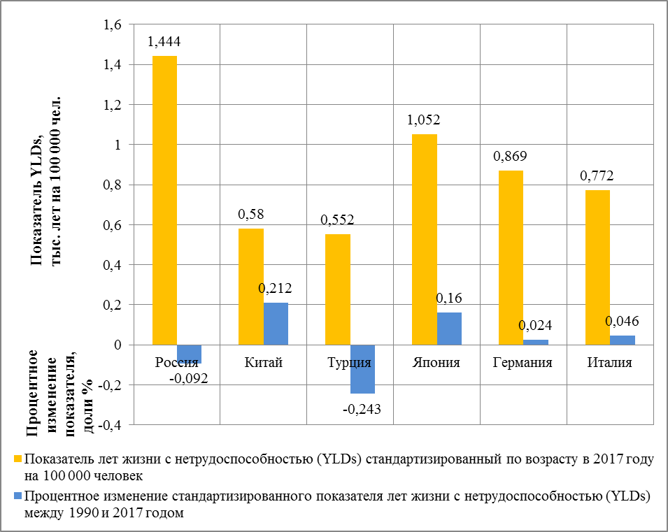 Китай и Турция выбраны для исследования в связи с тем, что они отнесены к одной группе SDI индекса с Россией, однако имеют значения производственного травматизма значительно ниже. Япония, Германия, Италия выбраны из-за наилучших темпов снижения показателей YLL, YLD, DALY. На рис. 2-5 приведены данные по показателям травматизма на 100 000 человек и процентные изменения между 1990 и 2017 годом [2].