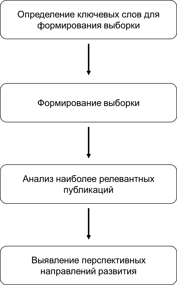 Выборка сформирована по ключевым словам: «машинное обучение» и «строительство». Всего в выборке собрано 59 публикаций. Для дальнейшего анализа выбраны публикации с наибольшим количеством цитирования, как наиболее релевантные. Таким образом, схему проведения исследования можно представить в виде укрупненного алгоритма, представленного на рис. 2.
