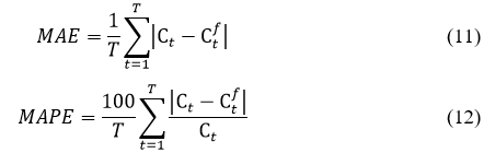 Эффективность метода оценивалась через среднюю абсолютную ошибку (MAE) и среднюю абсолютную ошибку в процентах (MAPE) между прогнозируемыми и реальными затратами на энергию в соответствии с уравнением (11) и (12).
