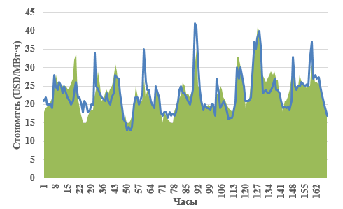 Метод машинного обучение с подкреплением протестирован с использованием информации о стоимости и мощности рынка электроэнергии, полученной из открытых источников с помощью расширения Data Miner. Информация для обучения была взята в период с 1 января 2022 г. по 21 февраля 2022 г., а затем выполнено прогнозирование затрат в период с 22 по 28 февраля 2022 г. Архитектура используемой нейронной сети сдержит 5 слоев: 1 входной слой с 18 нейронами, 3 скрытых слоя с 40, 20 и 10 нейронами и 1 выходной слой с 1 нейроном.