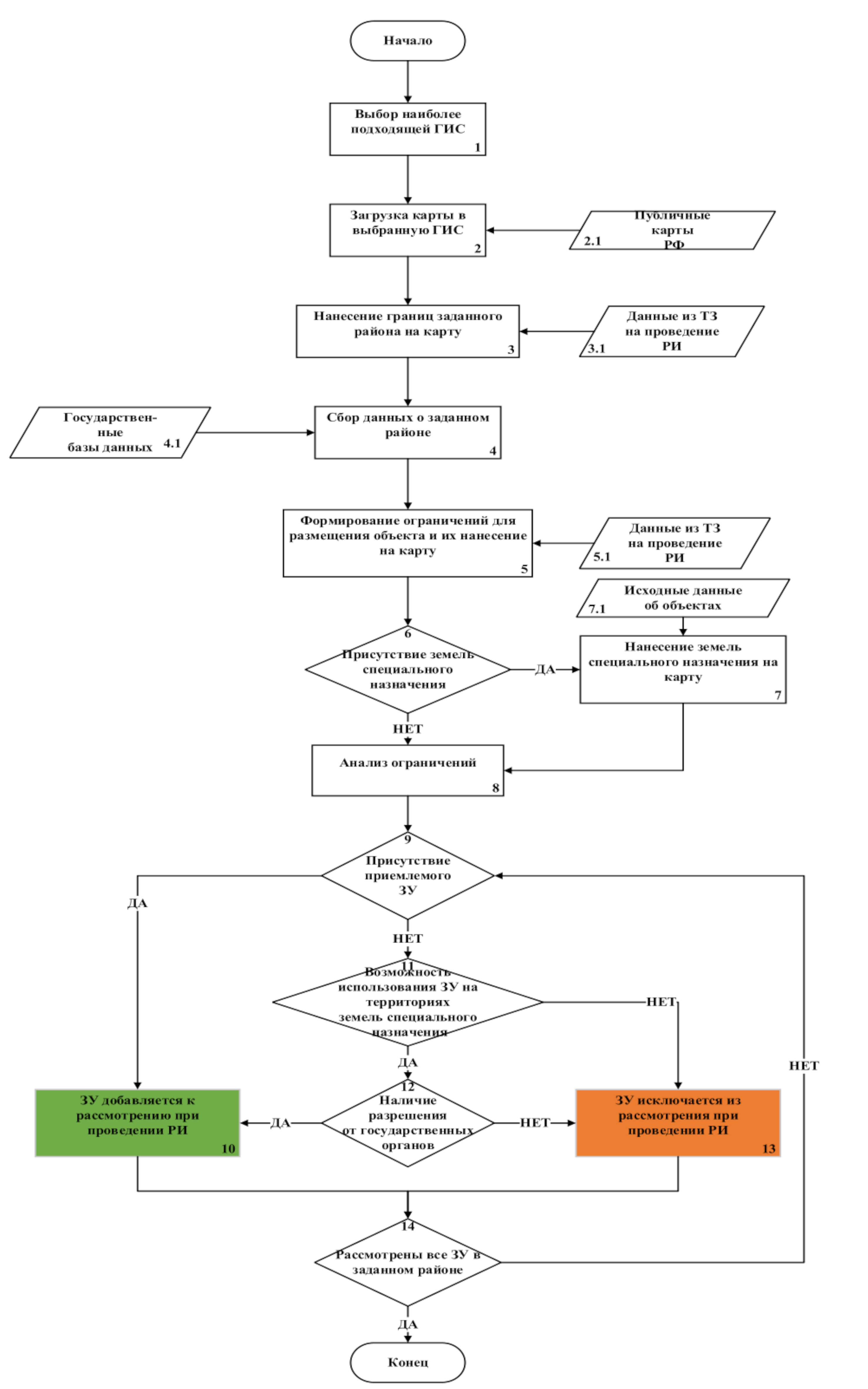 На землях специального назначения требуются дополнительные согласования от государственных органов (блок 12). Если удалось получить такое разрешение, то земельный участок добавляется к рассмотрению при проведении РИ (блок 10). Если в результате процесса согласования был получен отказ от государственных органов, то земельный участок исключается из рассмотрения при проведении РИ (блок 13) [13].