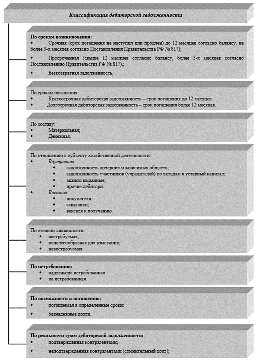 В различных компаниях используют классификации дебиторской задолженности по следующим классификационным признакам: