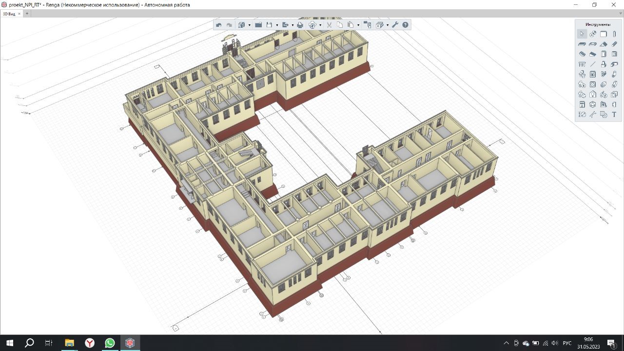 В процессе разработки модели выявилось, что программа ArchiCAD изначально была создана для архитекторов и дизайнеров, а не для строителей. Большинство ее функций направленны на создание интерьера и элементов ландшафта. В сфере строительства и моделирования двухмерных и трехмерных конструкций программа ArchiCAD не может быть полноценно использована для создания BIM- моделей, таким образом для создания цифрового двойника здания главного корпуса необходимо выполнить моделирование здания в другом программном комплексе [14].