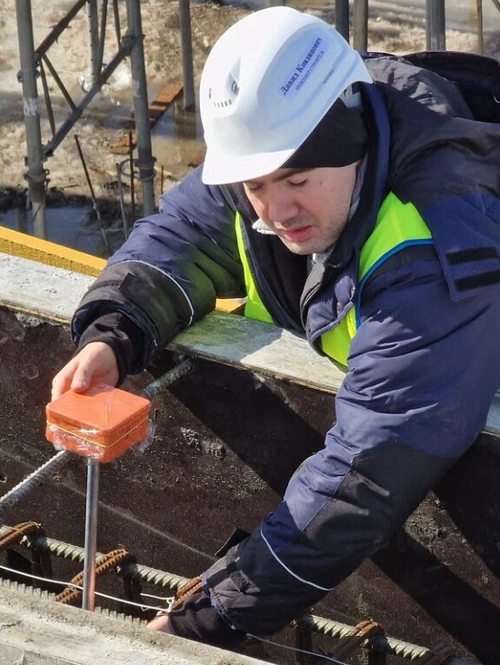 Шаг 2. Производится крепеж датчиков на арматуре перед заливкой бетона;