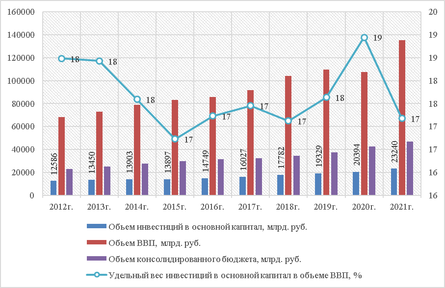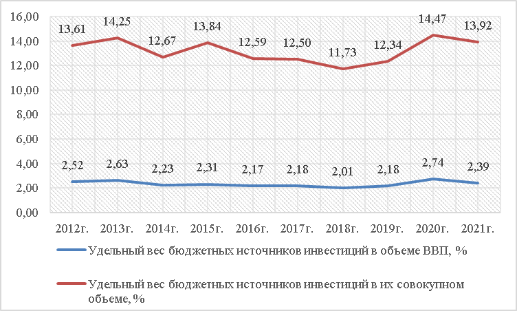Согласно официальным статистическим данным к концу 2021г. темп роста инвестиций в основной капитал составил 184,6% от уровня 2012 г. (рис. 1) Этот показатель меньше, чем десятилетний темп роста ВВП, который обозначился на уровне 198,6%. При этом за весь анализируемый период удельный вес инвестиций в ВВП не превышал 17-18%, достигнув максимального значения в 2020г. (19%).