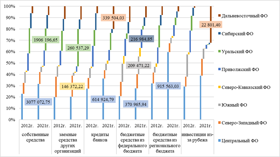Предметом исследования являются сложившиеся условия финансирования инвестиций экономическими субъектами отдельных федеральных округов России. Объектом исследования выступают статистические наборы данных об источниках финансирования инвестиций в основной капитал.