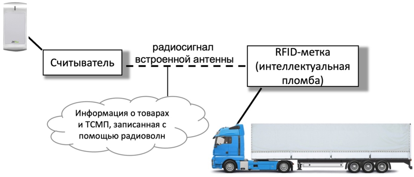 Одним из неотъемлемых элементов реализации парадигмы цифровизации системы предоставления таможенных услуг как государственными органами, так и частными организациями представляется система прослеживаемости товаров [14], основополагающей технологией которой является интеллектуальная пломба для бесконтактного прохождения ТСМП через ИПП – обязательный элемент оснащения каждого ТСМП, содержащий исчерпывающую информацию об объектах контроля. В рамках реализации указанного направления предполагается имплементация RFID-технологии [7], принцип работы которой показан на рис. 1.