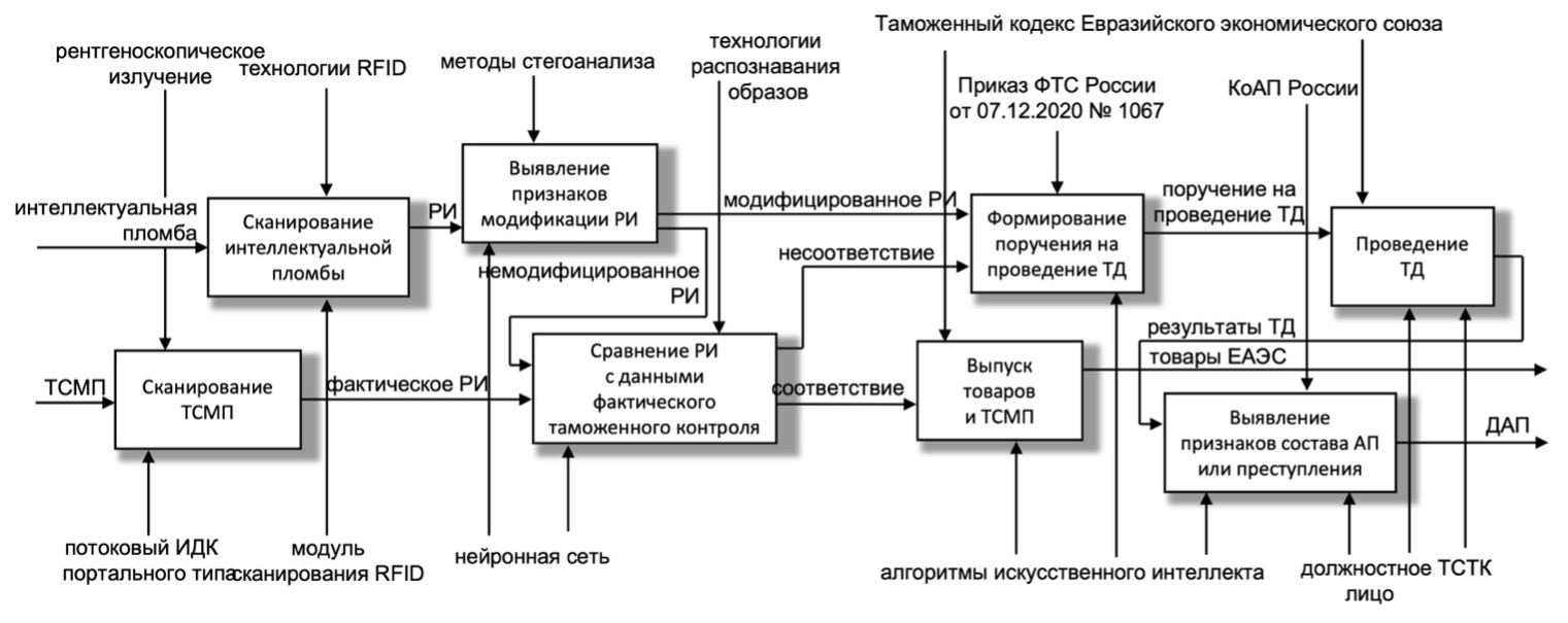На сегодняшний день сформирована общая научно-методическая основа оснащения таможенных органов техническими средствами таможенного контроля (далее – ТСТК) с учетом рекомендаций ООН и ВТамО (П.Н. Афонин, Д.Н. Афонин, Е.Г. Анисимов, В.Г. Анисимов [6], Ю.И. Сомов). Проблематика внедрения в деятельность таможенных органов алгоритмов искусственного интеллекта в рамках осуществления фактического таможенного контроля также поднимается в научных трудах (Р.В. Давыдов [7,8], Д.Б. Жуков [9], П.Н. Афонин, Д.Н. Афонин, А.А. Берзан [10], А.Ю. Лебедева [11]), при этом стратегические тенденции интеллектуализации таможенных органов и динамичность процесса формирования угроз и рисков определяют необходимость комплексного подхода к техническому и цифровому аспектам модернизации, в связи с чем исследование является актуальным и научно новым.