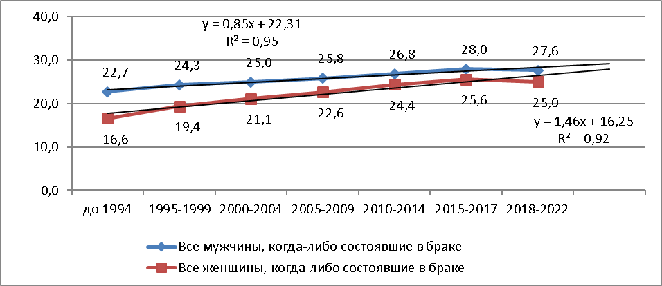В организации семьи в динамике произошло изменение среднего возраста, вступающих в брак – мужчины – с 22,7 в период до 1994 г. до 27,6 лет в период 2018-2022 гг., женщины с 16,5 до 25 лет соответственно. Полученная линейная зависимость показывает дальнейшее увеличение среднего возраста вступающих в брак, хотя в периоде 2018-2022 гг. произошло и некоторое снижение этого показателя.