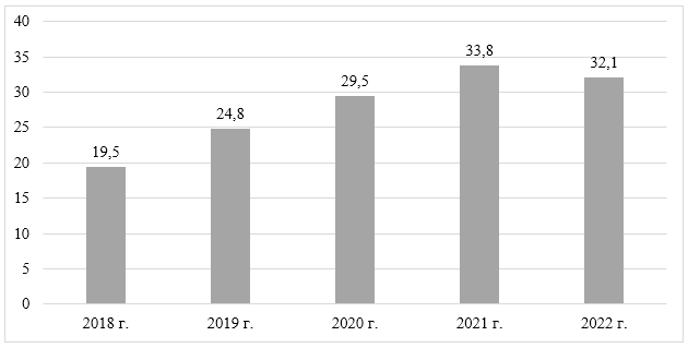 Отметим, что в 2022 году оборот рынка ИТ-решений в сфере ремонта недвижимости составил 32,1 млрд. руб., что на 4,8% меньше, чем в 2021 году, в 2020 году данный показатель составлял 29,5 млрд. руб., что на 18,9% больше, чем в 2019 году. Такая тенденция возникла по причине экономических и политических шоков, которые возникли в 2020 году (пандемия короновируса) и в 2022 году (российско-украинские отношения, санкции против России). В результате оборот рынка ИТ-решений в сфере ремонта недвижимости упал, что всецело повлияло на экономические критерии и на снижение ВВП государства.