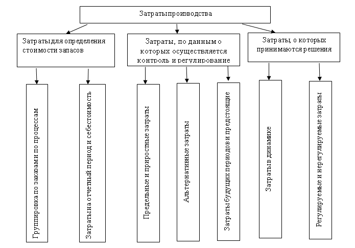Ч. Т. Хорнгрен и Дж. Фостер [35] определяющим моментом системы учета затрат в поиске классификационного признака выделяют цели и задачи этой системы. Подчеркивая, что система учета затрат концентрируется не только на калькулировании для оценки запасов и определения прибыли. А также, формирует информацию для принятия множества решений, среди которых: определение продукции для производства, установление продажной цены продукции (работ, услуг), выбор материалов и оборудования для приобретения, оценка работы менеджеров компании, решения о продолжении работы целых подразделений, служб, цехов и другие. В этой связи экономисты предлагают разделение затрат на: