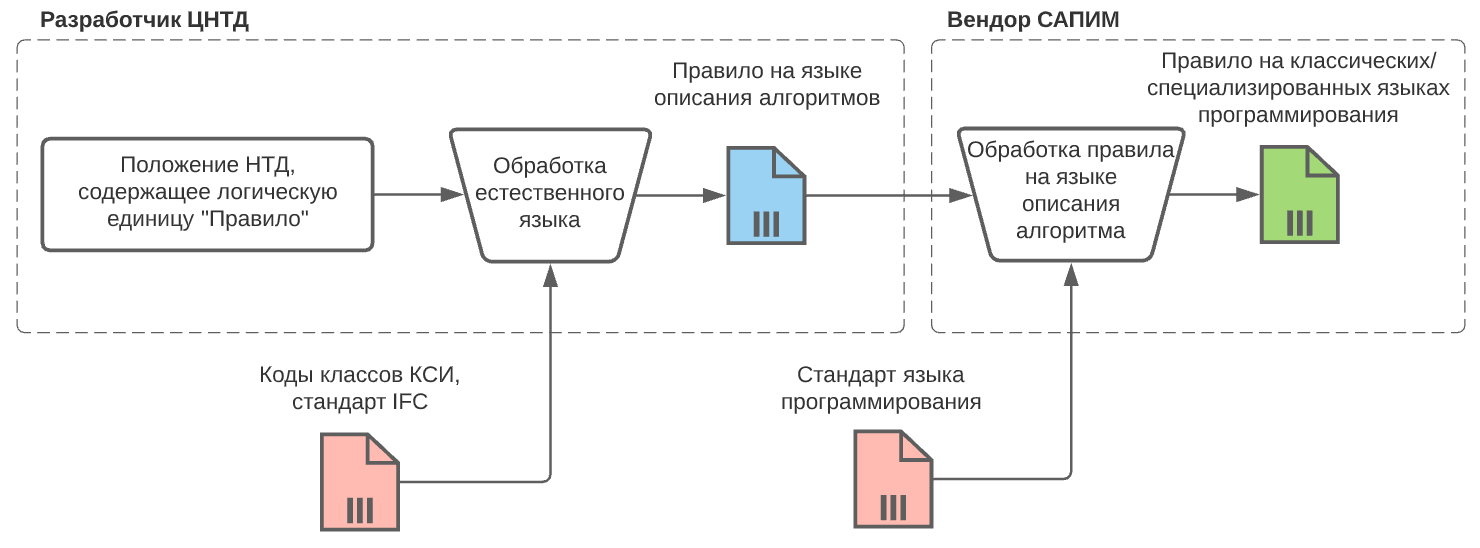 Если говорить о применимости цифровых стандартов в строительной отрасли, то принципиально их назначение можно разделить на две части. Первая касается их применения в привычном человекочитаемом формате, но с применением цифрового инструментария, позволяющего проводить анализ положений НТД, производить выявление нормативных коллизий, выявление дефицита или избыточности требований. Данная часть ЦНТД представляет собой непосредственно теоретическую основу положений НТД, представленную в машиночитаемом виде. Вторая часть касается непосредственно цифровых информационных моделей. Здесь имеет место быть интеграция с программным обеспечением, реализующим принципы информационного моделирования, в виде базы требований по проектированию, системы поддержки принятия решений и автоматизированных проверок ЦИМ на соответствие требованиям НТД. Данная часть ЦНТД формируется на основе теоретической части положений ЦНТД с использованием языка описания алгоритмов (рис. 1).
