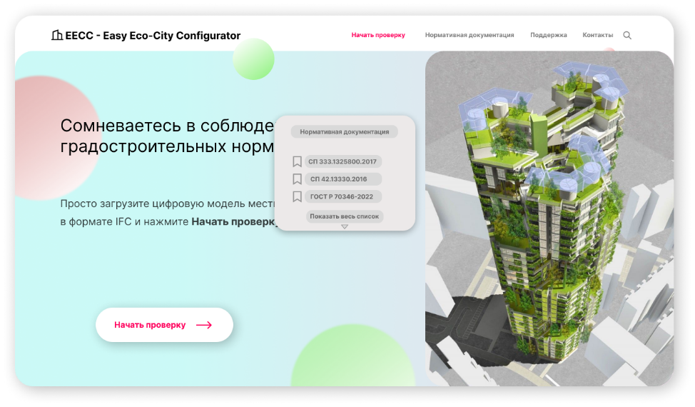 На первом шаге разрабатывается модель (высокая степень детализации LOD архитектурных элементов на данном этапе не важна), согласно схеме, изображенной на рис. 2. Далее ЦММ в формате IFC загружается в конфигуратор автоматизированного планирования территории застройки (смоделирован в web-приложении Figma[2]) с учетом всех градостроительных и, вместе с тем, экологических норм проектирования. На рис. 3 – 5 представлен интерфейс данного конфигуратора.