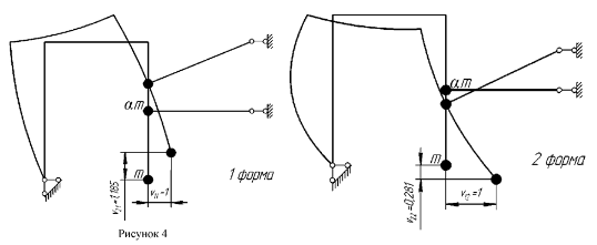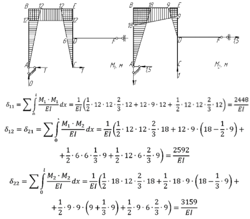 Приложим единичные усилия по направлению колебаний сосредоточенных масс, построим единичные эпюры моментов, и определим коэффициенты указанного «векового» уравнения, рис. 5: