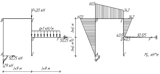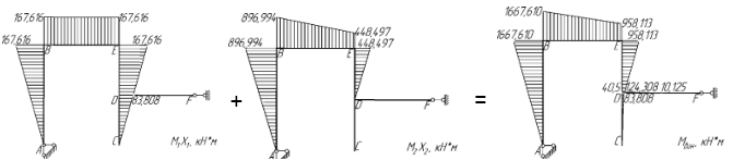 Решая систему канонических уравнений определяем амплитудные значения инерционных сил x1 = -13,968 [кН] и x2 = -49,833 [кН]. Теперь можно построить «исправленную» динамическую эпюру моментов, рис.10, с учётом