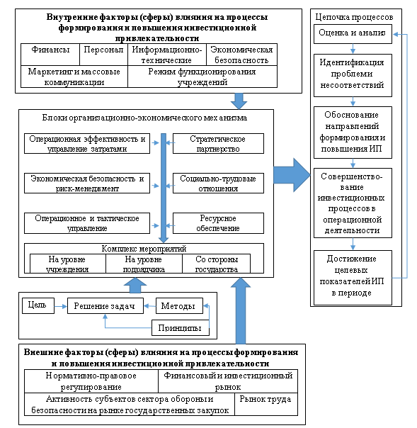 Повышение уровня ресурсного обеспечения интегрированных организационных структур в производственном секторе УИС, модернизация их производственной базы, а также привлечение квалифицированного инженерно-технического персонала требует существенного повышения привлекательности данных структур для вложения средств (инвестирования). Инвестиционная привлекательность рассматривается нами, как специфическая характеристика производственно-хозяйственной системы, определяющая уровень заинтересованности инвесторов и представителей других контактных аудиторий осуществлять вложения, направленные на развитие данной структуры. Учитывая особый характер деятельности исследуемого типа интегрированных производственно-хозяйственных структур, на наш взгляд, следует разработать соответствующий организационно-экономический механизм, отвечающий требованиям, учитывающим все характеристики деятельности казенных учреждений УИС.