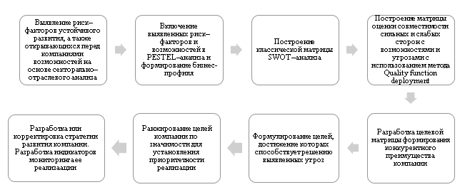 Для выявления угроз и возможностей компании рекомендуется использовать PESTEL–анализ, так как он позволяет дополнительно оценивать влияние экологических и климатических рисков. Кроме того, подход может быть модифицирован включением алгоритма количественной оценки влияния факторов. Например, для этого определяется влияние на отрасль каждой компоненты выявленного фактора как сильное/среднее/слабое, устанавливаются веса компонент методом попарного сравнения с переводом в баллы, а сила влияния факторов переводится в числовые значения с расчетом результирующих весов путем умножения веса компоненты на вес фактора. С учетом силы влияния определяется срочность реагирования на каждый фактор в баллах, и характер влияния (отрицательный (минусовые баллы)/ положительный). Путем умножения результирующего веса фактора на срочность реагирования и характер изменения рассчитывается окончательная оценка влияния каждого фактора. Факторы с отрицательной оценкой рассматриваются как угрозы, с положительной - как возможности. Результат PESTEL – анализа может быть представлен в виде диаграммы профиля бизнес–среды эконмических субъектов отрасли в разрезе политической, экономической, социальной, технологической, правовой и экологической компонент. На следующем этапе проводится традиционный SWOT–анализ по направлениям: общая стратегия, система управления, финансы, маркетинг, человеческие ресурсы, технологии, корпоративная культура, продукт), который также можно усовершенствовать путем введения количественной оценки влияния рисков. Для этой цели может быть рекомендован матричный метод Quality Function Deployment (QFD), позволяющий сформировать количественную оценку взаимосвязи сильных и слабых сторон с возможностями и угрозами компании, и на этой основе определить векторные направления ее устойчивого развития. Анализ влияния тех или иных возможностей и угроз на бизнес проводится в сравнении с главным конкурентом. Понимание взаимосвязи между сильными сторонами при проведении стратегического анализа может оказать существенное влияние на формирование стратегии и конкурентного преимущества компании, что может быть обусловлено следующими обстоятельствами: