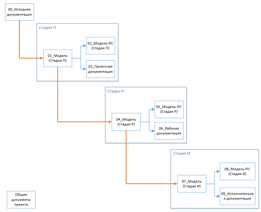 В связи с тем, что исходными данными (00_Исходная документация) пилотного проекта может быть документация с разных стадий проектирования, то и структура проекта, и точка его начала могут меняться, т. е. начальная точка пилотного проекта зависит от исходных данных (Стадия П или Р) . Как правило, для пилотного проекта берется документация стадии П.