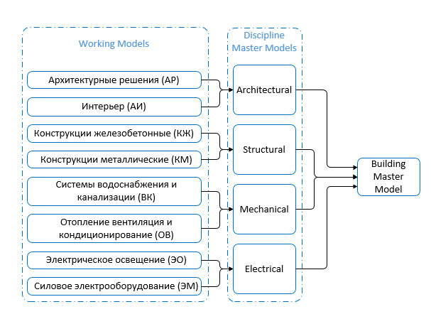 По согласованию с заказчиком данная структура может быть ориентирована на реализацию пилотного проекта, отвечающего одной стадии (например, проектная документация), однако большинство компаний стремится к внедрению ТИМ на всех стадиях проектирования.