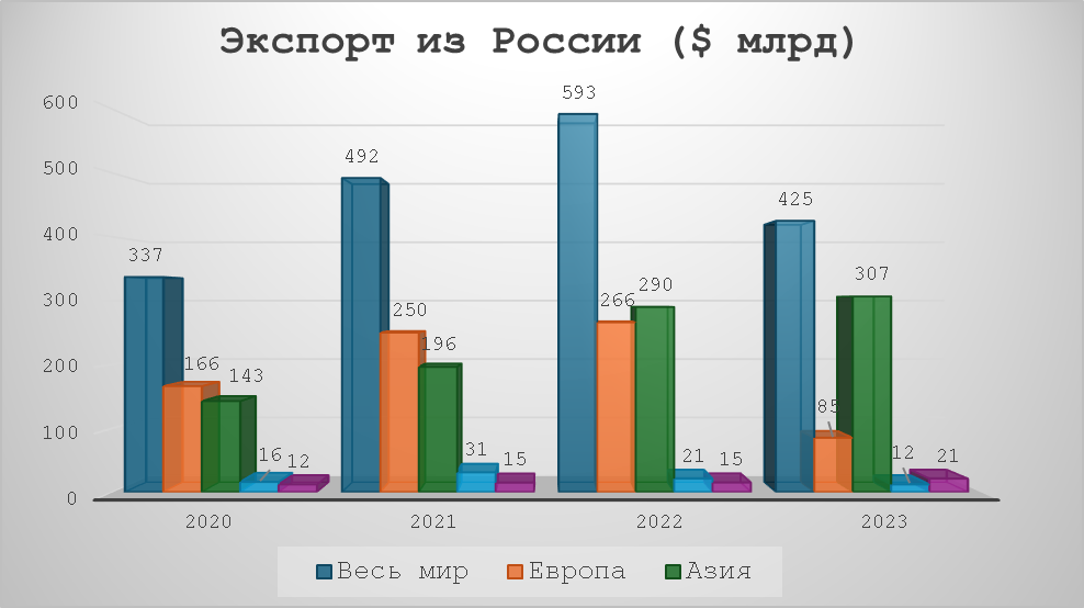Помимо прочего, экспорт оказывает влияние на политику России по адаптации к санкционным ограничениям и переориентации на дружественные страны. За последние 2 года с момента начала Специальной военной операции (СВО) произошли изменения торгового оборота России с партнёрами. Российский экспорт испытывает множество трудностей, объясняющихся санкциями, утратой прежней логистики поставок, что оказало влияние на сокращение экспорта в 2023 году на 28,3% по сравнению с 2022 годом (с 592,5 до 425 млрд долларов) преимущественно за счёт падения поставок в Европу на 68% от значений 2022 года (рисунок 1). При этом произошло характерное увеличение торговли с Азией и Африкой. Если смотреть в процентном соотношении, то увеличение поставок в Африку произошло на 48% от предыдущих годовых значений, в то время как в Азию на 5,6%, при этом физические объёмы экспорта в Азию в разы выше, чем в Африку. Также надо учитывать высокую базу 2022 года, так как относительно 2021 года снижение российского экспорта в 2023 году произошло лишь на 13,6%, а в сравнении с 2020 годом и вовсе показатели выросли на 26,1%. В целом изменения, отражены следующим рисунком: