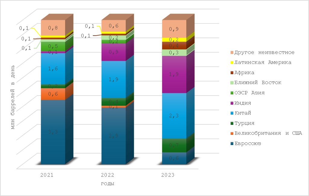Рисунок 2 – Средний экспорт Россией нефти по странам и регионам, 2021–2023 годы, составлено автором на основе данных International Energy Agency [21].
