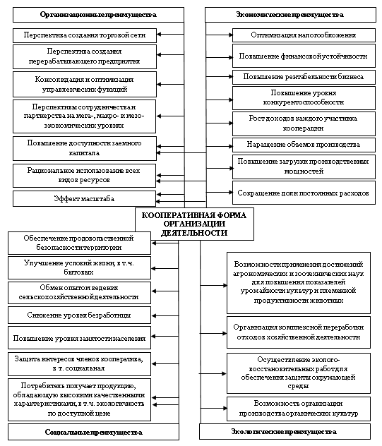 Важность и стратегические преимущества формирования вертикальной организационной структуры системы потребительской кооперации обуславливается тем, что входящие в ее состав структурные элементы – организации, как правило, характеризуются малыми размерами и имеют широкое территориальное распределение. Анализ научно-исследовательских работ таких отечественных авторов как основе Аверьянова Е.В. [2], Дусаева А.Х. [3], Злобин А.А. [4], Крылов В.С. [5], Сирбиладзе К.К. [6], Сумарокова М.А. [7] позволил выделить и классифицировать преимущества кооперативной формы организации, позволяющие осуществлять процесс ведения сельскохозяйственной деятельности эффективно с экономической, социальной, экологической и организационно-управленческой точки зрения.