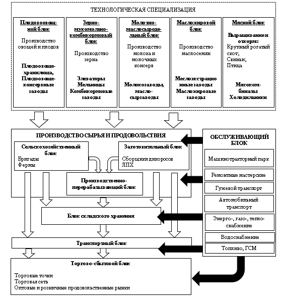 Кооперационная форма организации труда позволяет обеспечить всестороннюю согласованность совместный действий участников трудового коллектива, обмениваться опытом ведения сельскохозяйственной деятельности, а также обеспечивать социальную защиту интересов всех участников организации кооперации. Рациональное использование трудовых, производственных, материальных и финансовых ресурсов позволяет получать дополнительный экономический эффект. На рисунке 3 представлена схема кооперационного объединения сельскохозяйственных подразделений по принципам технологической специализации и этапам производственного процесса, с выделением блока обслуживающих подразделений, который состоит из: ремонтных мастерских, машинотракторного парка, системы транспортного обеспечения, включая гужевой, энерго- и топливного обеспечения.