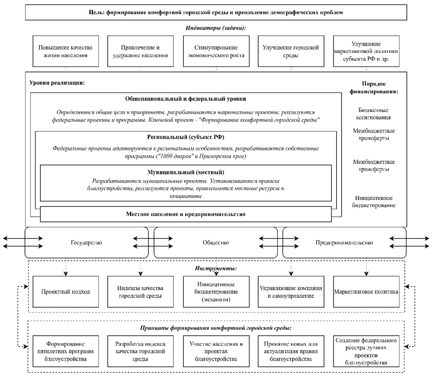 Помимо обозначенного, Н.В. Боровских и ТА. Чижикова [15] указывают на значение комфортной городской среды как инструмента маркетинговой политики на уровне субъекта РФ, которая используется для привлечения внимания граждан и стимулирования миграции. Причем регионы заинтересованы в реализации такой политики, поскольку, фактически, от неё напрямую зависит способность региональной экономики формировать доходы, стимулировать отчисления в региональный бюджет. Н.В. Боровских и ТА. Чижикова выделяют, что современные регионы реализуют согласованные специализированные программы по формированию городской среды, которые впоследствии становятся визитной карточкой для привлечения населения. В Приморском крае одним из таких проектов является национальный проект «Жилье и городская среда», который призван, первично, решать жилищный вопрос и стимулировать граждан к активному принятию участия в улучшении городской среды, вторично, формировать комфортную городскую среду, в том числе при работе с дворовыми (придомовыми) территориями. В 2022 году Приморский край характеризуется как регион с «неблагоприятной городской средой», поскольку показатель индекса качества региона составил 174 балла из 360 возможных (оценка от 0 до 180 баллов соответствует «неблагоприятной городской среде); тем не менее, регион обладает всем необходимым потенциалом для изменения ситуации [16]. Помимо обозначенной программы, в регионе реализуется ключевой Федеральный проект «Формирование комфортной городской среды», который не затрагивает дворовые (придомовые) территории; в ответ на осознание значимости, Правительство региона наряду с Минвостокразвития РФ реализует проект «1000 дворов» [17], в рамках которого предполагается осуществление ремонтных и благоустраивающих работ на дворовых (придомовых) территориях, для чего привлекается население, а средства реализуются с фокусом на нецелевой характер финансирования.