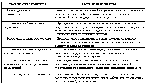 Процедуры анализ финансовых данных (табл.1): финансовых отчетов, сверка данных и выявление аномалий в финансовых показателях, что может указывать на возможное мошенничество; необычных или сомнительных транзакций, несоответствий в финансовой отчетности, неправильных учетных записей и неожиданных изменений в финансовых показателях.