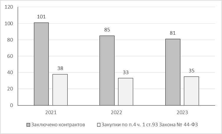 На рисунке 1 представлены сведения по заключенным контрактам. В 2021 году контрактной службой ФТС России заключен 101 государственный контракт по итогам проведенных закупочных процедур, реализовано 38 государственных контрактов у единственного поставщика по п. 4 ч. 1 ст. 93 Федерального закона № 44-ФЗ, в 2022 году – 85 и 33 государственных контрактов, в 2023 году – 81 и 35 государственных контрактов соответственно.