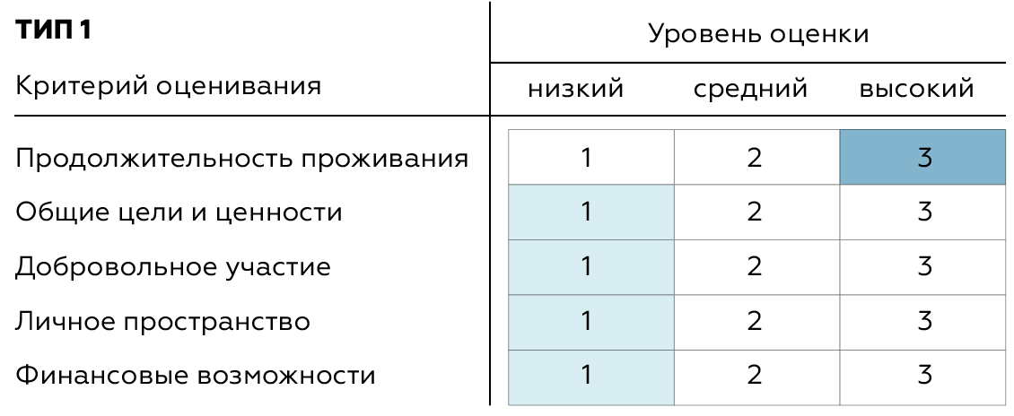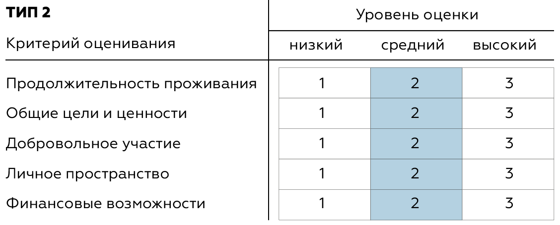 Основные характеристики типа – это краткосрочность проживания, высокие финансовые возможности у проживающих, достаточное личное пространство, участие на добровольных условиях, общие цели и ценности.