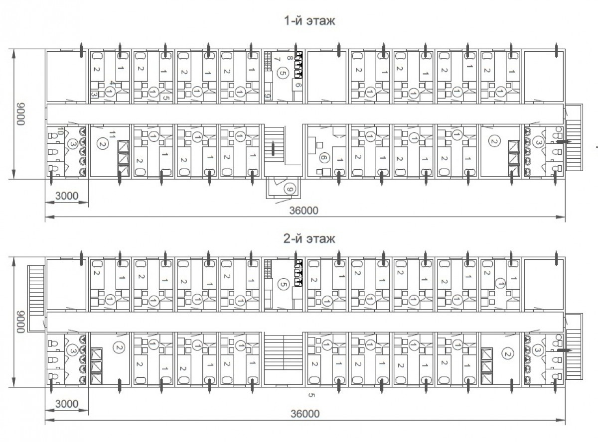 Жилые помещения в общежитиях предоставляются из расчёта не менее шести квадратных метров жилой площади на одного человека3. Несмотря на схожие характеристики с типом 1, с планировочной точки зрения функциональная структура меняется: появляются пространства, предназначенные для общественной жизни, бытовая зона выносится на отдельные этажи здания, за пределы жилых ячеек. Отдельно выносятся помещения для культурно-массовых мероприятий, помещения общественного питания, помещения хранения и другие. Таким образом, жилая ячейка подразумевает больше личного пространства и возможности уединиться. Появляется граница между частным и общественным.
