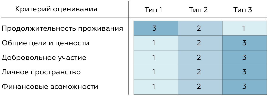 В исследовании было выделено три типа совместного проживания по критериям долгосрочности и наличию общих целей. К ним относятся: