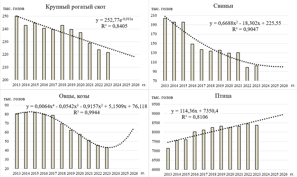 Анализируя численность поголовья скота и птицы за 2013-2023 гг., отметим снижение показателя крупного рогатого скота (КРС) в хозяйствах всех категорий с 250,1 до 221,6 тыс. голов, примерно на 11,4%. Спад наблюдается в хозяйствах всех категорий, кроме крестьянских (фермерских) хозяйств и индивидуальных предпринимателей, где наблюдается рост единицы КРС - с 10,3 до 24,8 тыс. голов. Поголовье свиней в 2023 г. увеличилось на 3,6% в сравнении с прошлым годом, но, если рассматривать весь период с 2013 по 2023 гг., то оно сократилось с 204 до 102,4 тыс. голов. Также, следует отметить снижение показателя поголовья овец и коз с 80,7 тыс. голов в 2013 г. до 43,1 тыс. голов в 2023 г., на 46,6%. Положительная динамика отмечается в численности птицы – с 7141,9 до 8378,4 тыс. голов. При сохранении выявленных тенденций, в 2025 г. можно ожидать снижение значений показателей численности поголовья крупного рогатого скота ~ до 219,1 тыс. голов, свиней ~ до 100,7 тыс. голов и рост количества поголовья овец и коз ~ до 52,0 тыс. голов, птицы ~ до 8837,1 тыс. голов (рис.4).