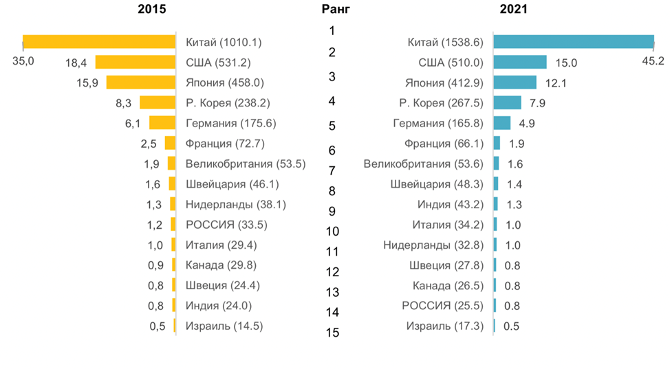 Для сравнения приведем пример Китая, где общие расходы на исследования и разработку составили свыше 3 триллионов юаней, что эквивалентно 418,2 миллиарда долларов США. Это на 10,1% больше, чем 2021 году. Руководством страны был поставлен план на 14-ю пятилетку (2021-2025) по ежегодному увеличению инвестиций на 7%.