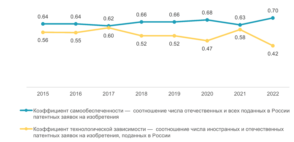 Из приведенных данных видно, что доля Китая с 2015 по 2021 г. выросла с 35% до 45% и втрое превысила долю США, в пятерку лидеров входят так же Япония, Корея и Германия, а Россия занимает 14 место с долей 0,8%. Причем, не все заявки в России поданы резидентами. В своем исследовании Институт статистических исследований и экономики знаний НИУ ВШЭ рассчитали коэффициент технологической зависимости как соотношение иностранных и отечественных патентных заявок, поданных в России (см.Рисунок 2). Из полученных данных видно, что в 2022 году коэффициент самообеспеченности вырос, что означает рост доли отечественных ко всем поданным заявкам на патенты.