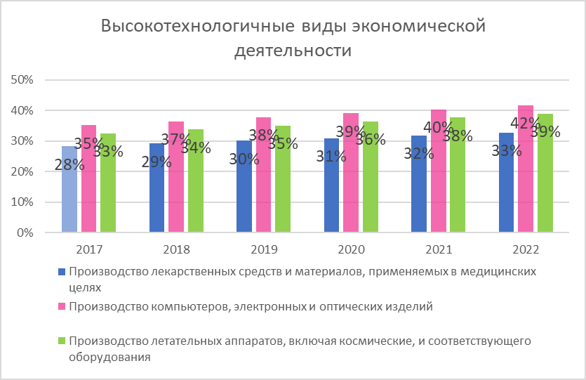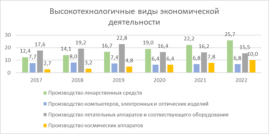 Ограниченность ресурсов, включая капитал и рабочую силу, определяет необходимость выделить конкретные отрасли и сектора для достижения как технологического суверенитета, так и максимального мультипликативного эффекта для экономики страны в целом. Рассмотрим три высокотехнологичные отрасли: производство лекарственных средств, производство компьютерных, электронных и оптических изделий, а так же производство летательных аппаратов. Продукция указанных отраслей имеет важнейшее значение для России по нескольким причинам:
