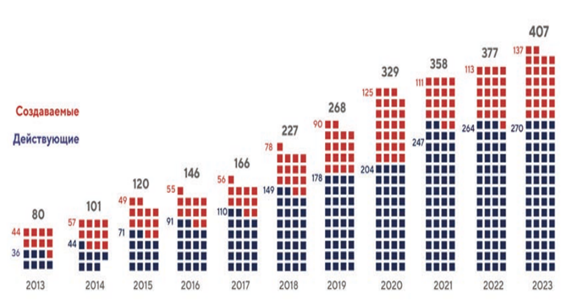 Рисунок 1 - Динамика действующих и создаваемых индустриальных парков в РФ в 2013 – 2023 гг., единиц [8]