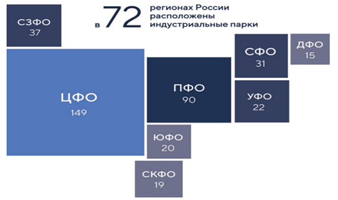 Существенное превосходство числа индустриальных парков в ЦФО объясняется более высокими характеристиками инфраструктурного и социально-экономического развития. Тем не менее, государство делает акцент и на увеличение числа индустриальных парков на всей территории, что реализует системный подход к инновационному развитию промышленного комплекса регионов и балансирование интересов бизнеса, власти, общества в долгосрочной перспективе.