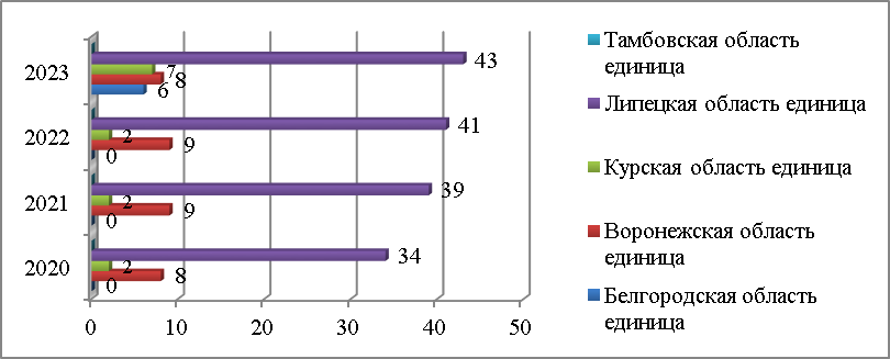Рисунок 4 - Динамика количества резидентов технопарков регионов ЦЧЭР в 2020 – 2023 гг., единиц [6]