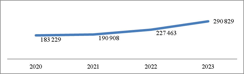 Технопарки предоставляют рабочие места в регионе, оживляя экономическую систему, производят инновационную продукцию, внося существенный вклад в импортозамещение и формирование технологического суверенитета. Динамика количества рабочих мест, созданных резидентами, осуществляющими деятельность в индустриальных (промышленных) парках в РФ в 2020-2023 гг. представлена на рисунке 5.