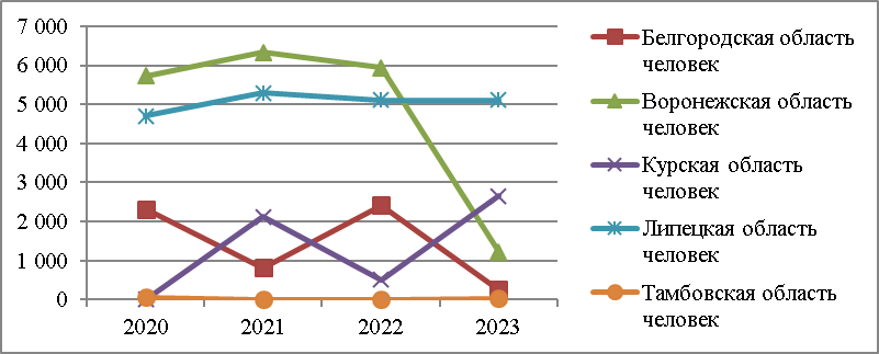 Рисунок 6 - Динамика количества рабочих мест, созданных резидентами, осуществляющими деятельность в индустриальных (промышленных) парках в регионах ЦЧЭР в 2020-2023 гг., человек [6]