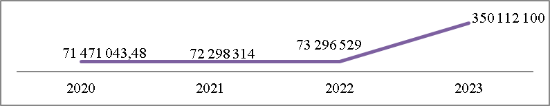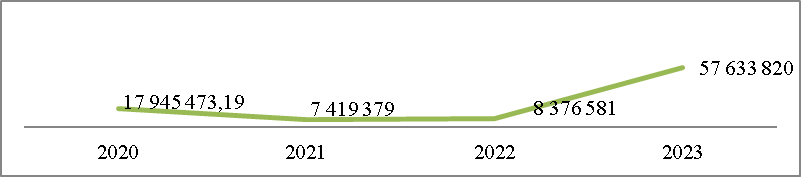 Рисунок 7 - Динамика объема инвестиций в проектирование и строительство объектов промышленной и технологической инфраструктуры промышленных технопарков в РФ в 2020 – 2023 гг., тыс. руб. [6]