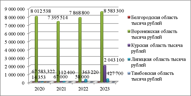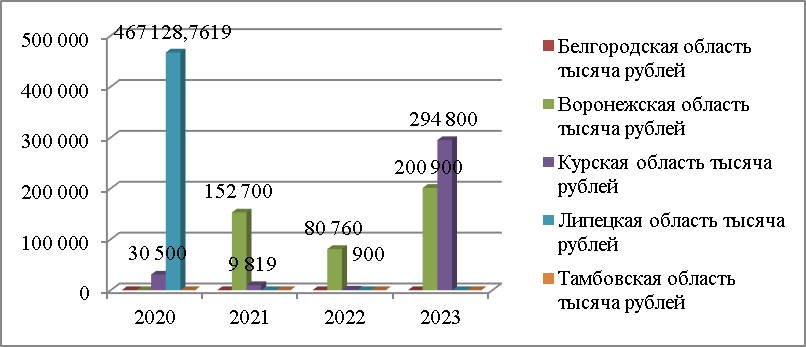 Рисунок 8 - Динамика объема инвестиций в проектирование и строительство объектов промышленной и технологической инфраструктуры промышленных технопарков в регионах ЦЧЭР в 2020 – 2023 гг., тыс. руб. [6]